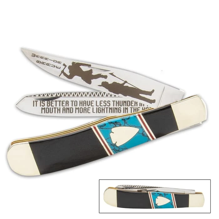 The Native American Trapper Pocket Knife is an attractive tribute to American culture and history. The trapper has razor-sharp stainless steel blades with black, laser-etched artwork and messages on each blade. The message etched on one blade is “It is better to have less thunder in the mouth and more lightning in the hand” and there is Native American artwork etched on the other blade. The handle scales are black pakkawood, separated by a synthetic turquoise panel that has an inlaid gold arrowhead medallion.