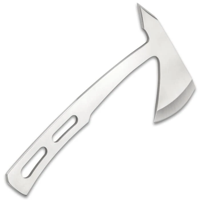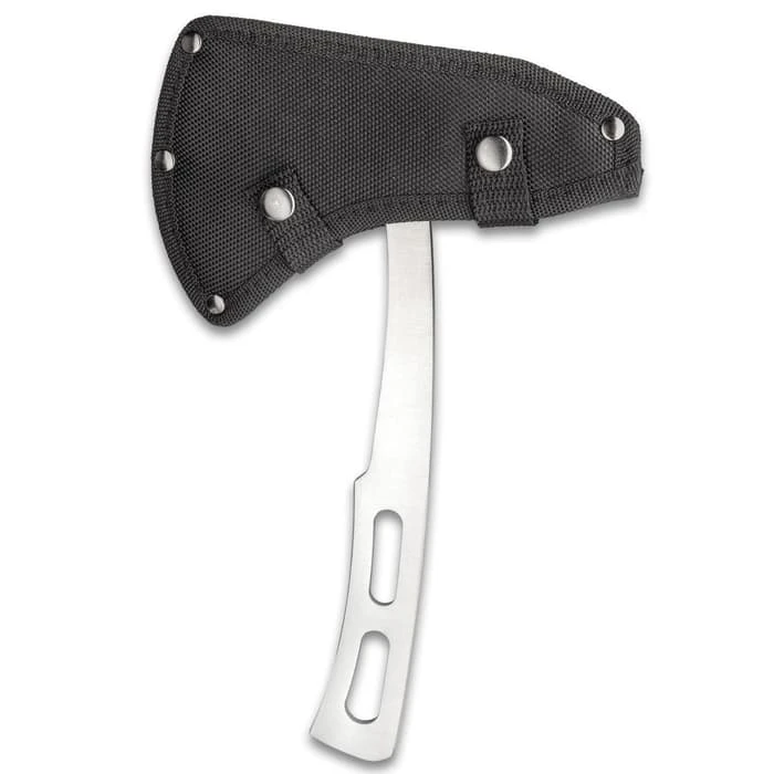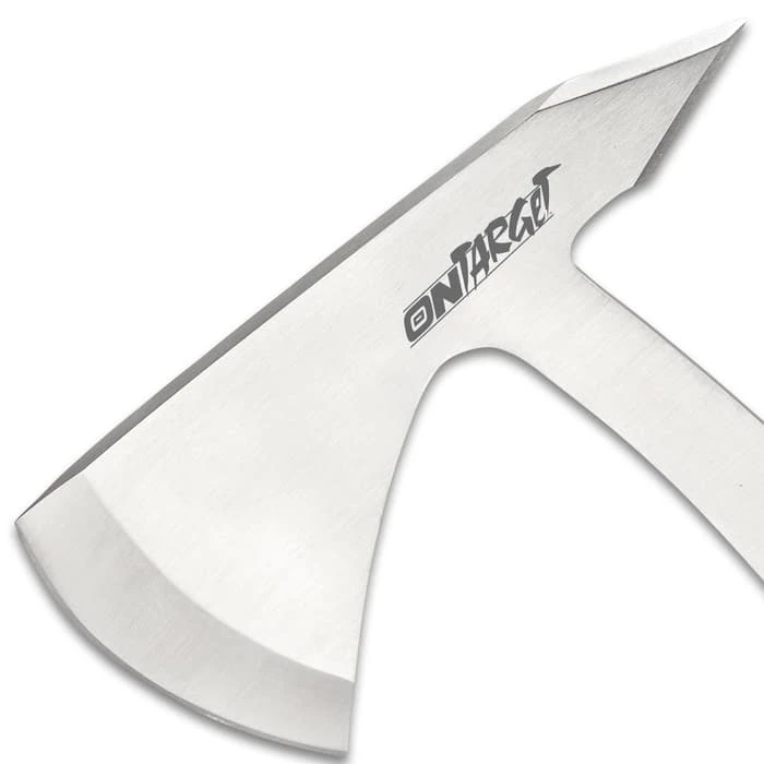 Perfect the art of axe-throwing with the lightweight and perfectly balanced On Target Throwing Axe. The aerodynamic design is almost guaranteed to improve your skills. The throwing axe has a one-piece, solid stainless steel construction with cut-outs in the handle and a slightly curved design. The 5 1/4โ head has a razor-sharp 2 3/4โ blade on one side and a penetrating, double-edged spike on the other side. The throwing axe comes with a sturdy nylon blade cover with secure snap closures and a belt loop for ease of carry.