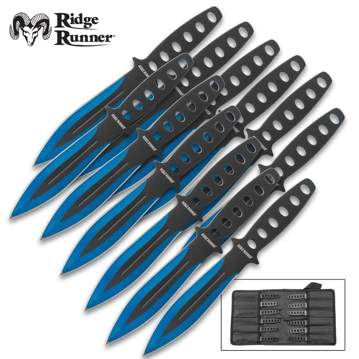 Ridge Runner Arctic Blue Throwing Knife Set And Sheath – 12 Pieces, Solid Stainless Steel Construction, Penetrating Point – Length 5 3/4”