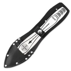 The Ridge Runner Horizon Knife makes a good all-purpose fixed blade for outdoor activities like hunting, camping and hiking. The knife has handle scales that are pakkawood bands in different hues of brown, secured with stainless steel pins, and both the pommel and half-guard are stainless steel. The full-tang, drop point blade is made of 3Cr13 stainless steel with a Damascus-style pattern laser-etched on it. A sturdy nylon belt sheath comes with the fixed blade so that it can be conveniently carried at your side.