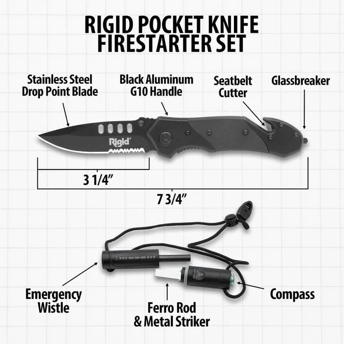 Rigid Pocket Knife And Firestarter Set – Stainless Steel Blade, G10 And Aluminum Construction