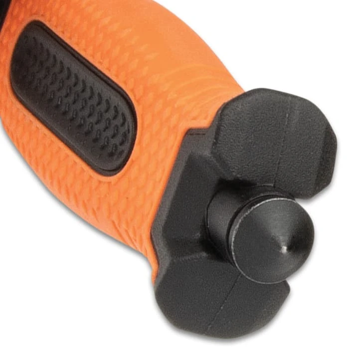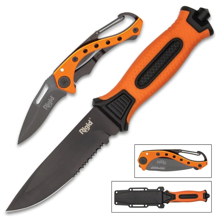 The Rigid Two-Piece Rescue Knife Set is a must-have addition to your rescue equipment or survival gear. It includes a tactical fixed blade knife with a sheath and a pocket knife with an integrated carabiner. The tactical fixed blade is compact enough not to take up too much room in your gear or on your belt but is powerful enough to have your back and the carabiner pocket knife can be clipped anywhere you think you might need a quick and reliable cutting tool. Each knife has a razor-sharp, stainless steel blade with the black fixed blade having partial serrations and the pocket knife having a cut-out nail nick for quick access. The tactical fixed blade has a tough, TPU handle with a highly textured, TPR grip and it features a stainless steel glass-breaker pommel, and the pocket knife has a lightweight, cast aluminum and sturdy TPU handle, which features a carabiner-style clip. The 9 1/2β overall fixed blade knife snaps securely into a molded plastic belt sheath, which also has lashing holes.