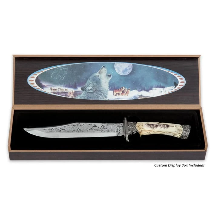 This Custom Running Wolf Bowie knife features intricate blade etchings and a wolf scene on the resin handle. It has a 6 3/4″ stainless steel blade and the bowie is 10 3/4″ overall. It comes in a full-color hardwood display box. This knife is a beautiful piece to add to your collection!