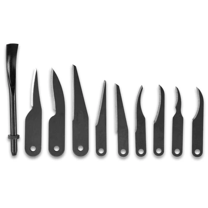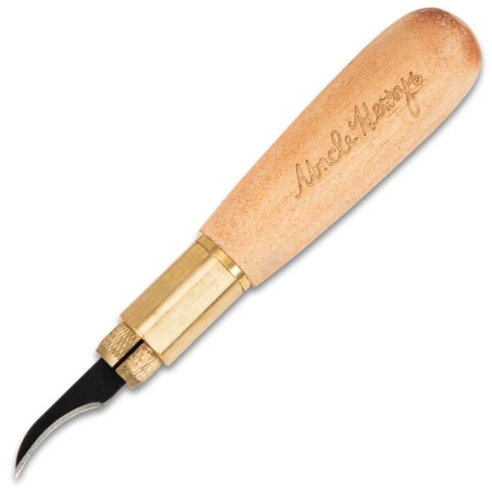 The Schrade Uncle Henry Wood Carving Set is a premium, all-inclusive blade set perfect for a veteran or beginner wood carver. The 4 3/5” wooden handle is comfortably rounded and has a three-way brass jaw chucking system to switch out the blades. All of the wood carving blades are made of 65Mn high carbon steel and there are a variety of sizes for different tasks. It includes a 5/16? x .030?, 20E x 15/16? radius ground on the outside curve, 21EX straight blade, 11 straight blade ground on the slanted edge, 10 1? radius ground on the inside curve, 8 2? radius ground on the inside curve, 22 2? radius ground on the inside curve, 1-LD2 1/2? x .050? heavy duty blade, 1-LN3 1/2? x .050? carving blade, 1-LS1 1/2? x .050? carving blade and 1-LBG- #7 sweep gouge 5/16? cut. The entire set fits in a premium case that uses magnets to keep the blades secure and in place when stored or carrying.