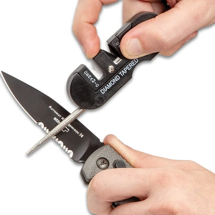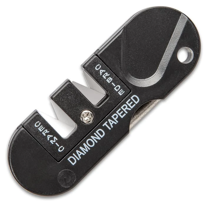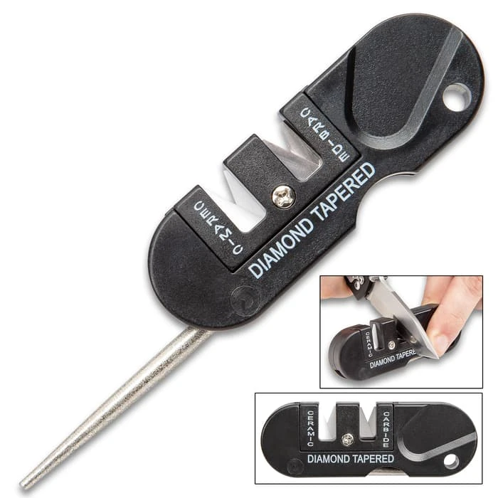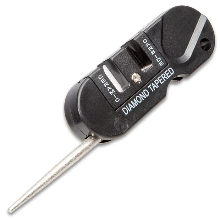 Sharpen It Up Knife Sharpener – TPU Housing, Ceramic, Tungsten Carbide, Diamond Tapered Rod, Lanyard Hole – Length 3 1/4”