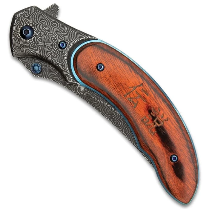 A design that combines traditional methods and innovative design, the Shinwa Shinigami is a modern pocket knife built by masters of ancient swordcraft. The knife has a 4” keenly sharp dark grey stainless steel upswept blade with a raised rain-drop like pattern and thumbstuds. The handle scales are reddish-brown bloodwood engraved with kanji and the bolster exactly matches the blade. The assisted opening pocket knife is 5”, when closed, and features a metallic blue steel pocket clip for ease of carry.