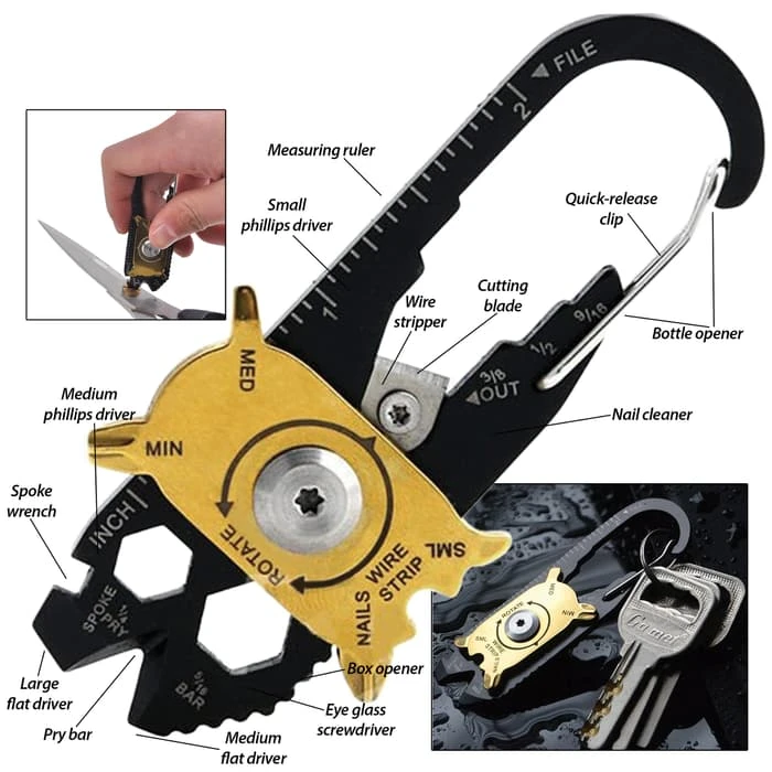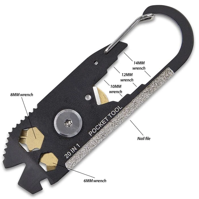 SHTF 20-In-1 Multi-Tool EDC With Carabiner Quick Release Clip – Various Sized Wrenches And Screwdrivers, Blade, Ruler, File