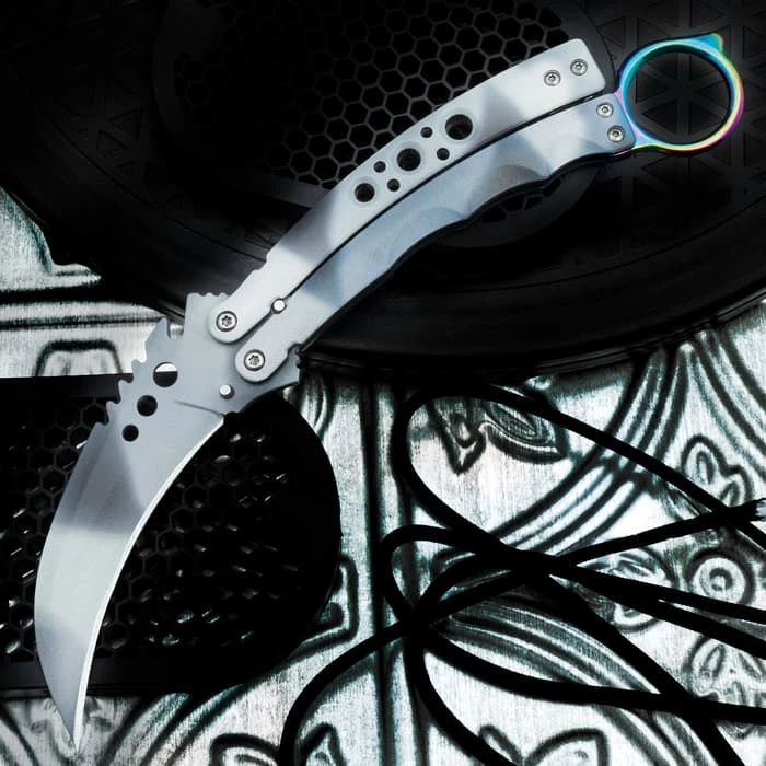 The Silver Hawk Karambit Butterfly Knife is an expertly designed and crafted combination of two traditional knives. It has an overall finish in hues of grey and silver. The karambit-style blade has a penetrating point and there’s a karambit-style open-ring pommel. The blade can be secured between the butterfly handles, which have weight-reducing thru-holes.