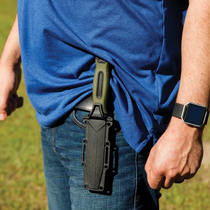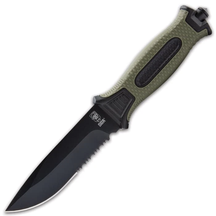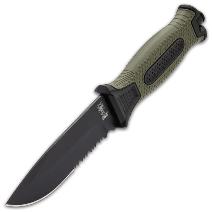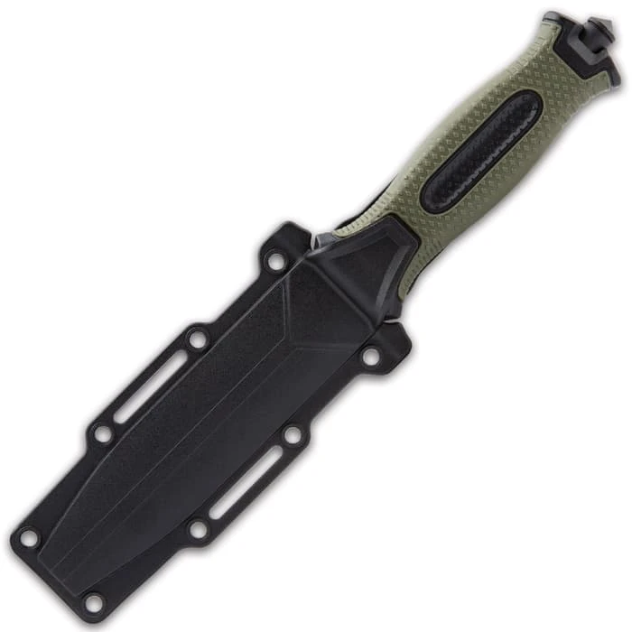 SOA Olive Drab Tactical Fixed Blade Knife And Sheath – Stainless Steel Blade, TPR Handle, Glassbreaker – Length 9 1/2”