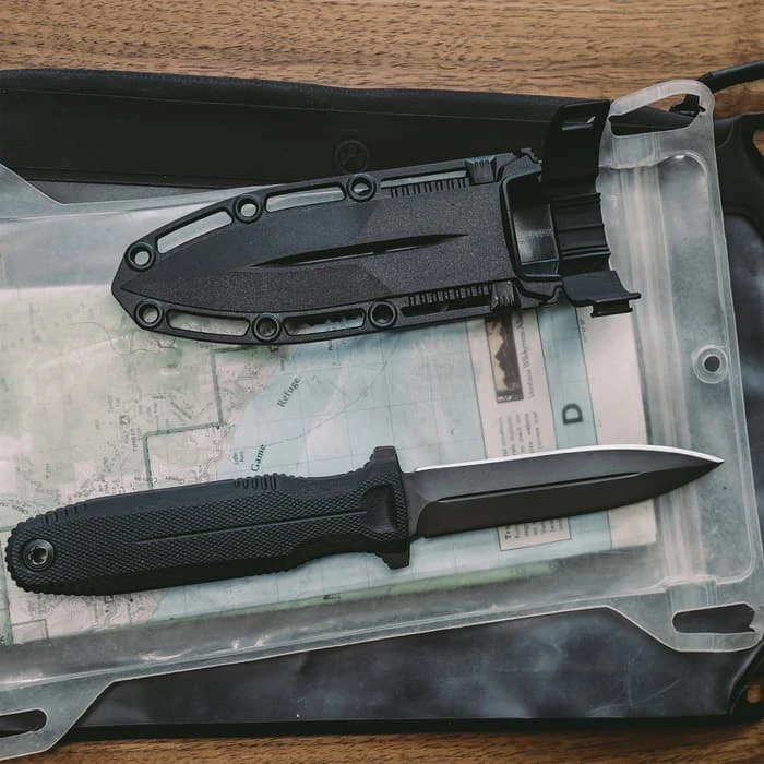 Representing an evolutionary step in hard-use fixed blade knives, the Blackout Pentagon FX is a full-sized knife made for the modern-day warfighter. It features a double-edge, full-tang CYRO S35VN steel blade, G10 handles and a glass-reinforced nylon sheath compatible with the next-generation Universal Mounting System. The sheath system isn’t the only thing that’s adaptable as the handles can also be removed for a slimmer profile. The Blackout Pentagon FX is fully customizable to meet the demands of various missions, and purposefully designed to exceed expectations.