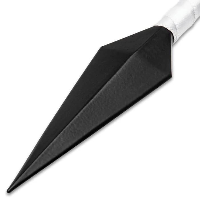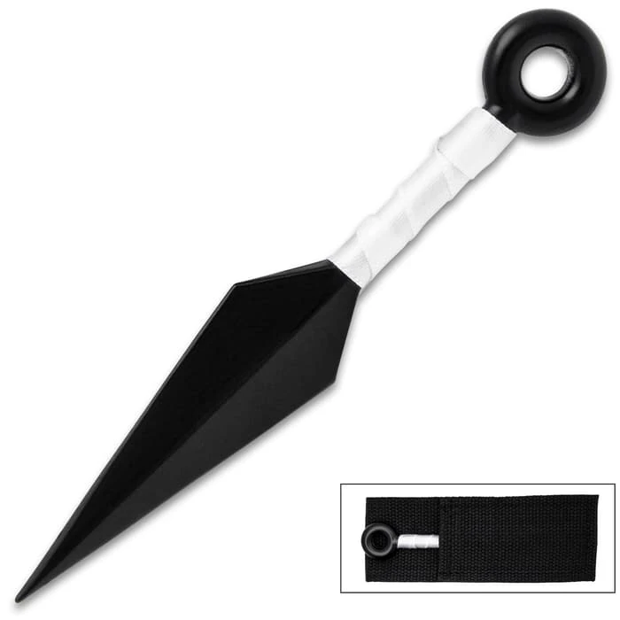 Discreetly hide theStinger® Kunai Throwing Knife on your person and be prepared to defend yourself when you need to! It’s made of one, solid piece of black stainless steel and has a 2 1/2” blade that goes down to a penetrating point. The handle is wrapped in white satin ribbon, and it has the traditional open-ring pommel. The 5” overall throwing knife comes in a nylon belt sheath for discreet carry anywhere.