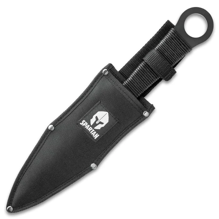 Our Super Spartan Throwing Dagger is quite the beast when it comes to throwing knives – just like the fearsome, ancient warriors it was inspired by. It has a solid, one-piece stainless steel construction with a black, non-reflective coating. The massive, 8 1/2” razor-sharp blade has a blood groove and penetrating point and features an embossed Spartan logo, so that you know it’s legit. The handle is wrapped in black cord for a comfortable, slip-free grip and features an open-ring pommel. The throwing dagger is 14 3/4” in overall length and comes housed in a sturdy nylon belt sheath featuring the Spartan patch.