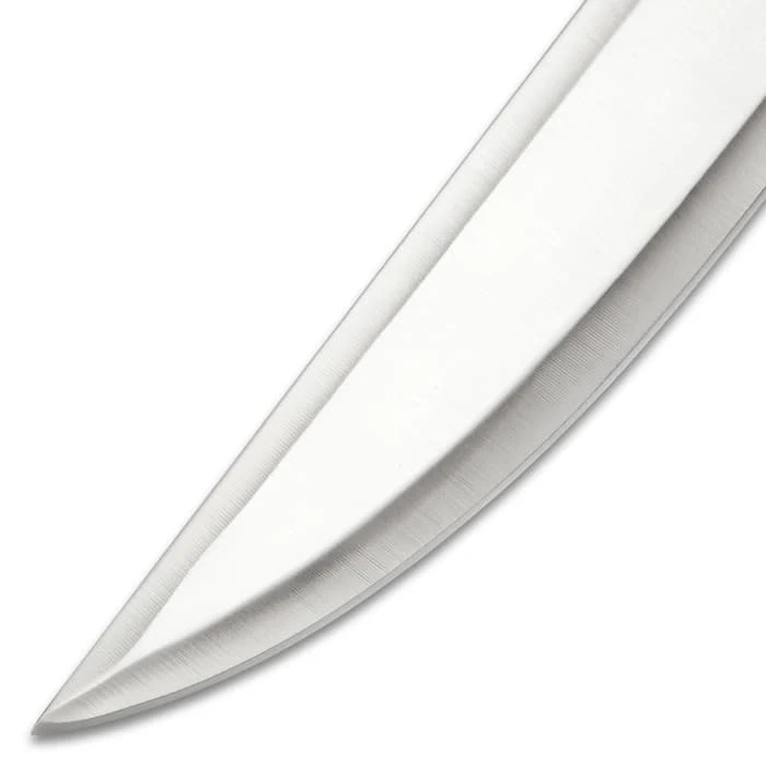 Looking for a real jungle beast to stalk the wild with you? The Timber Rattler Full-Tang Jungle Beast Machete is an intimidating, no-questions-asked 25” in overall length and the impressive 18 3/4” stainless steel blade makes up almost all of that length! The full-tang blade has a satin finish and is extremely sharp and capable. The handle has reddish brown wooden scales that are securely attached to the tang with sturdy stainless steel pins and features a lanyard cord. The blade slides into a tough nylon sheath that is a combination belt and shoulder harness sheath to give you different options of carry.
