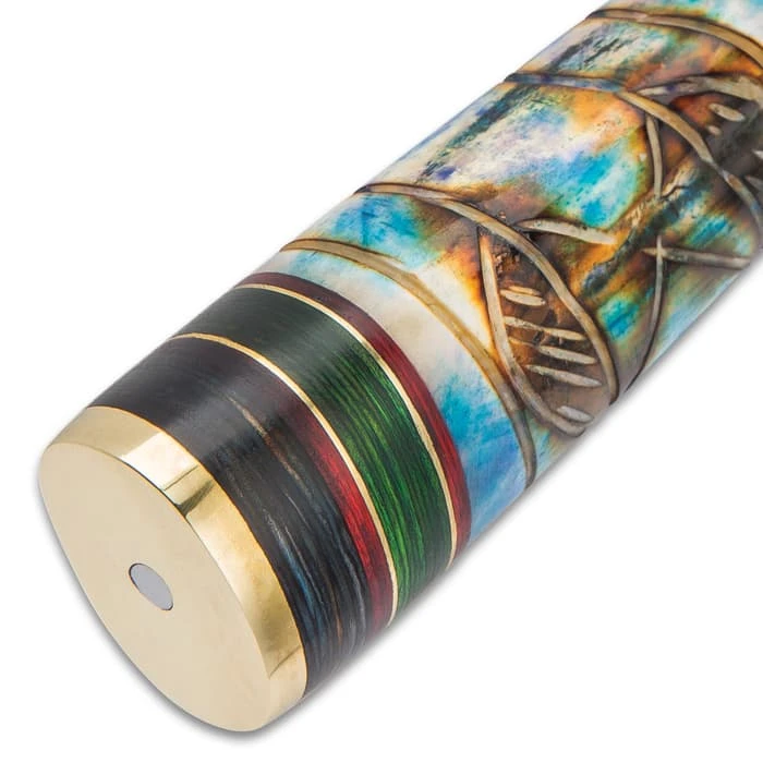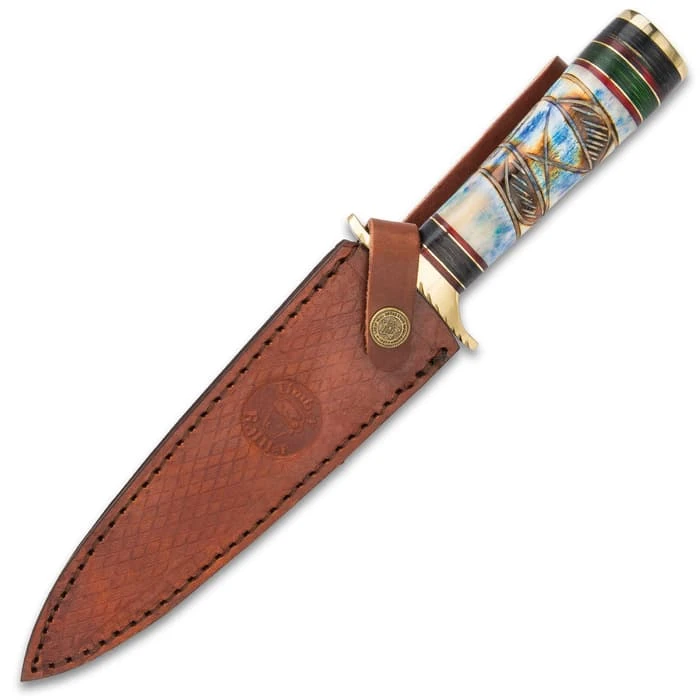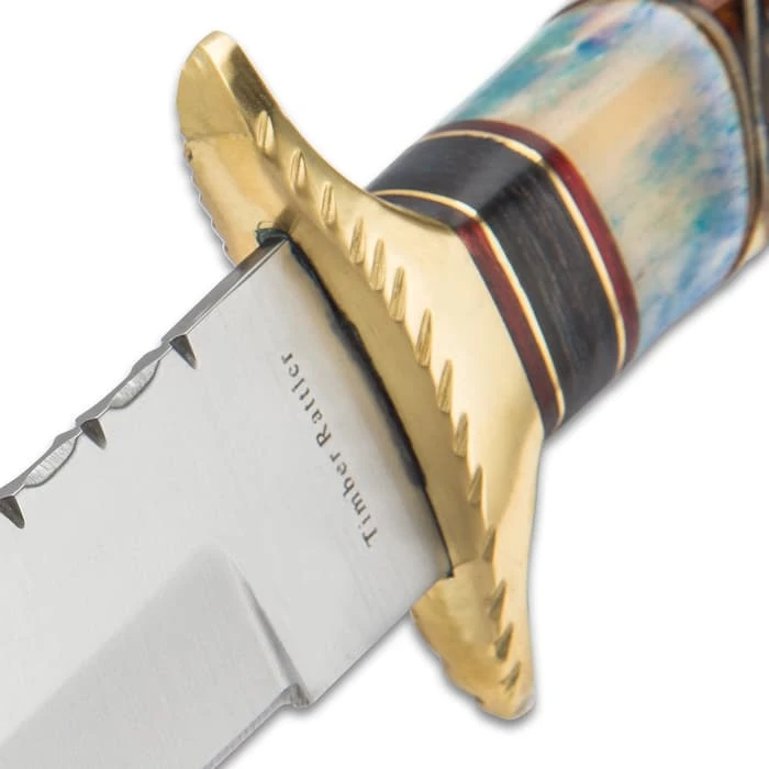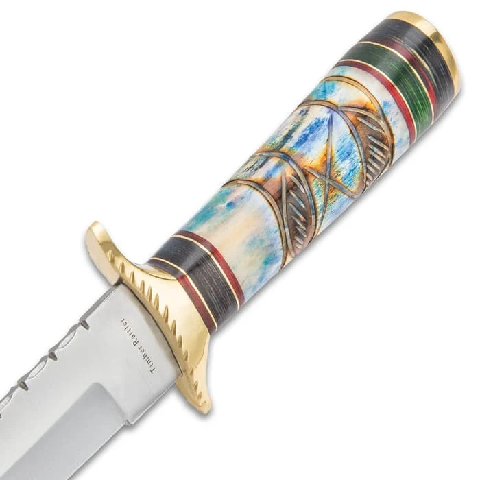 Teeming with both beauty and brawn, Timber Rattler’s “Raindance” Bowie is a dream for collectors and outdoorsmen alike. It features a resilient 420 stainless steel spear point blade, accented with distinctive scalloping along the spine. Rock solid and razor sharp, it’s great for myriad tasks, from fine, precision cutting to rigorous hacking and chopping, and everything in between. Regardless of the job, the Raindance will look great doing it, with its exquisitely carved handle, painstakingly crafted from rugged pakkawood and genuine bone. Azure vibrant blue stain highlights the delicate grain in the wood and bone for a vivid treat for the eyes! The handle is not only eye-catching and beautiful, it offers a “beautiful” grip and hand-feel, as well! Tough as nails and loaded with cutting clout and visual allure, the Timber Rattler Raindance is the total package. Rest assured: whether displayed in a collection or tested in the field, the Raindance always performs at the top of its game.