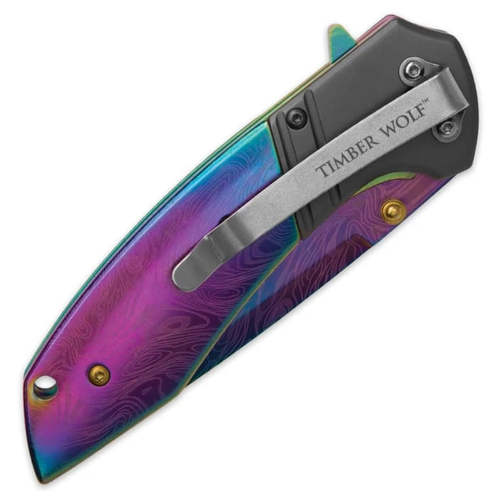 Timber Wolf Aurora Assisted Opening Pocket Knife – DamascTec Steel With Titanium Rainbow Finish