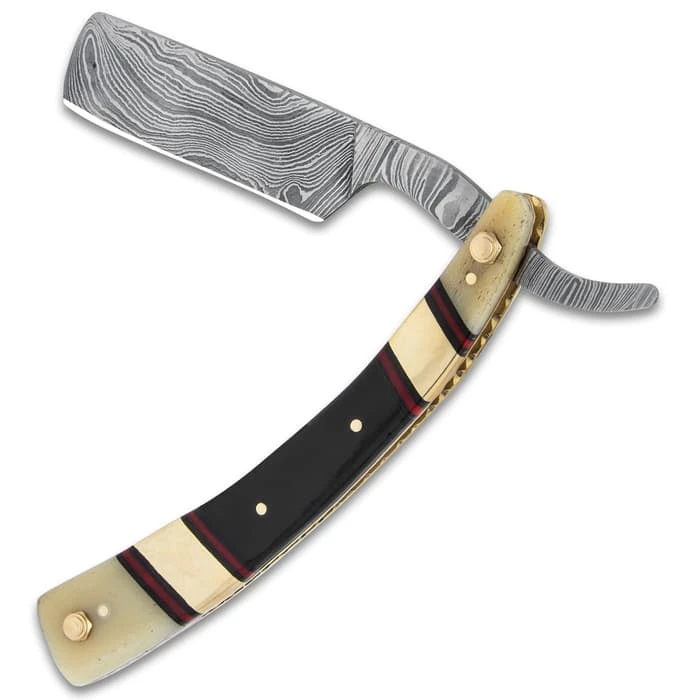 Timber Wolf Bowery Boys Razor Knife – Damascus Steel Blade, Bone And Brass Handle, Brass Pins And Liner – Closed 6 1/2”