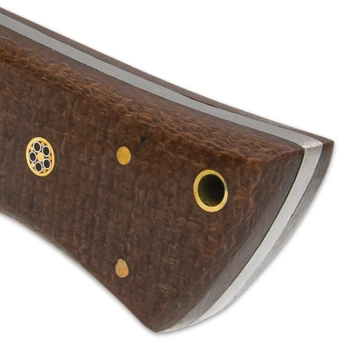 Always expanding and improving on customer favorites, Timber Wolf releases its Executive Cleaver Butcher Knife, a sharp and stocky fixed blade that’s at home in the kitchen, at the campsite, or out on the hunt. An updated version of the original Cleaver Butcher Knife, it features a sharply angled blade. The hefty 8 1/4”, full-tang Damascus steel blade is made to chop through any and everything including bone. The attractive black and brown wooden handle scales are secured to the tang with brass pins and the handle has a brass lanyard, as well. The cleaver knife is 13 1/2” in overall length.