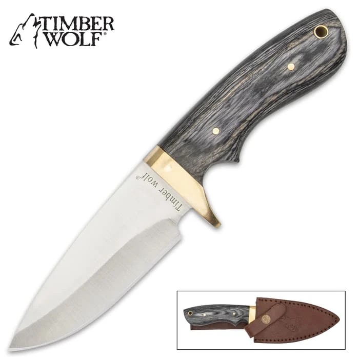 Timber Wolf Grey Skinner Knife And Sheath – Stainless Steel Blade, Pakkawood Handle Scales, Brass Half-Guard – Length 9”