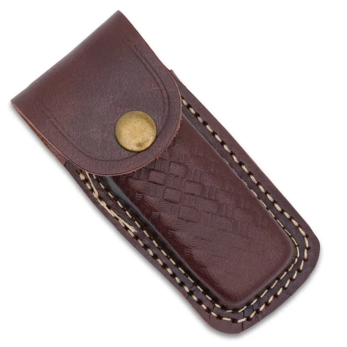 Inspired by the simple majesty of the Swiss Alps, the Timber Wolf Heidi Pocket Knife’s handle pays tribute to the beautiful Alpine flowers with a delicate brass flower design set into the wood. The clip point blade is Damascus steel with a fileworked spine that flows down from the handle. The wooden handle scales are secured with brass pins, which complement the brass flower design. Easily carry the handsome knife at your side in its leather belt sheath.