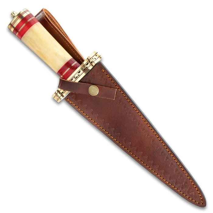 The Timber Wolf Karnak Temple Dagger may have been found on the hip of a temple guard at the height of ancient Egypt’s Upper and Lower Kingdom’s dominance. It has a sharp, 9 1/4” fire pattern Damascus steel triangle blade, which extends from a hefty, file-worked brass handguard. The handle is cream-colored genuine bone, accented with red wooden bands and brass spacers, complementing the brass pommel. The handsome 14 1/4” overall dagger slides securely into a premium leather belt sheath with embossed decorations.