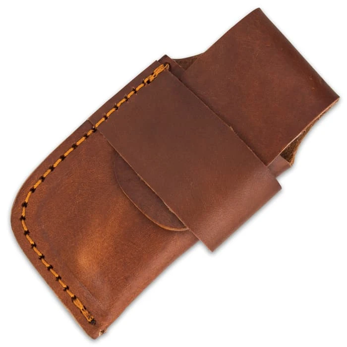 The Timber Wolf Knights Watch Pocket Knife is attractive and eye-catching, yet it is also a heavy-duty workhorse EDC. The knife has a 3 1/2” Damascus steel modified sheepsfoot blade that can be easily deployed with a brass thumbstud. The grooved handle scales are crafted of Damascus steel and the handle features fileworked brass liners. The assisted opening pocket knife is 4 1/2”, when closed, and can be carried in its premium leather belt sheath with snap closure.