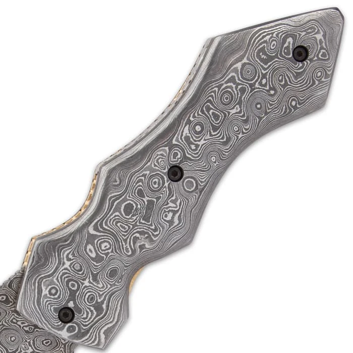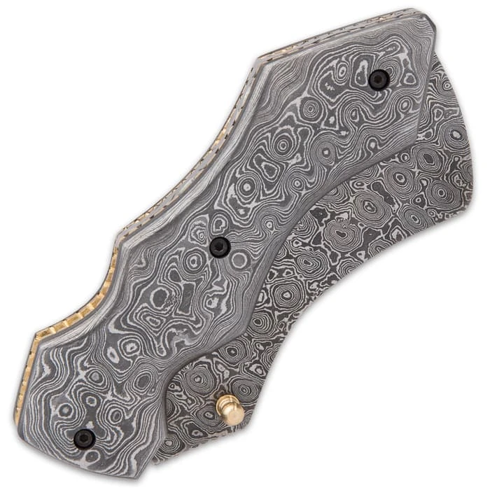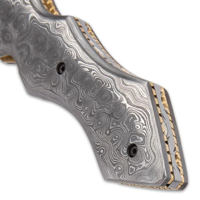 Timber Wolf Knights Watch Pocket Knife And Sheath – Damascus Steel Blade, Damascus Steel Handle Scales, Brass Fileworked Liners