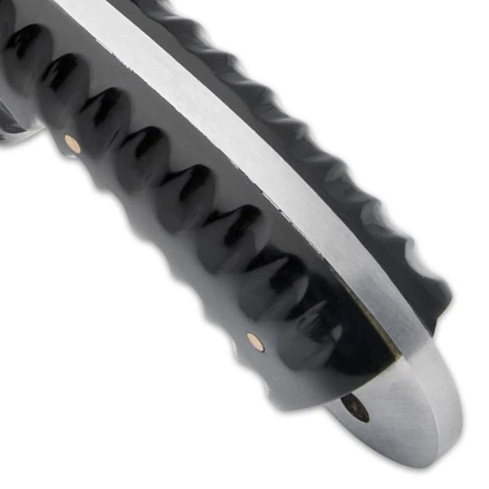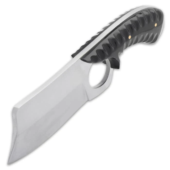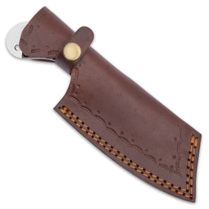 A great cutting and chopping tool to have when you’re camping, the Timber Wolf Mini Cleaver will tackle anything from kindling to game. It has a full-tang, 4 1/4” stainless steel cleaver blade with a finger ring and an extended tang with a lanyard hole. The handle scales are black bone with deep grooves for a secure grip and brass pins securing them to the tang. The 7 1/4” overall cleaver knife can be carried in its premium leather belt sheath, which has a snap strap and topstitching.