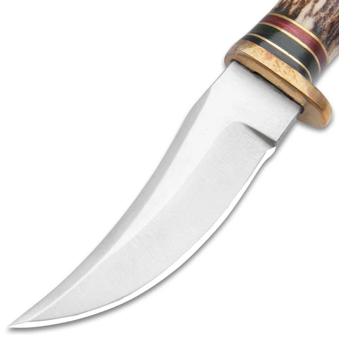 The Timber Wolf Mini Trail Knife is a great little tool for your outdoor adventure gear. Its size makes it easy to drop in any bag or carry on your belt. The genuine stag handle with its solid brass half-guard and pommel makes it tough and ready to withstand a lifetime of outdoor use. Each knife has a unique-looking handle because of the natural material that it’s made out of. The stainless steel trailing point blade with its penetrating point is perfect for a variety of cutting and piercing tasks that come up when you’re hunting, camping and boating.