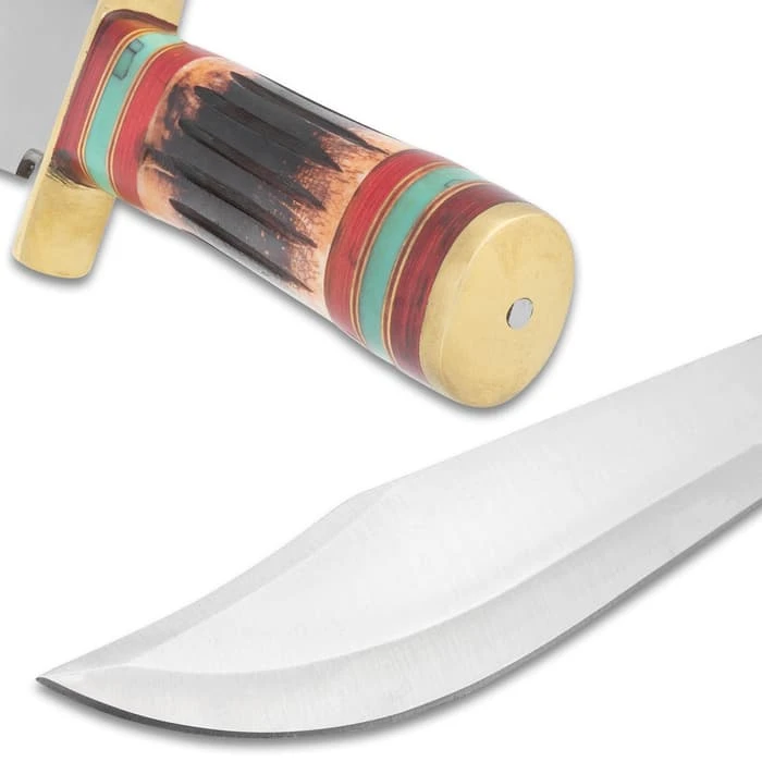 The Timber Wolf Navajo Bowie Knife has a beefy, clip point blade that’s razor-sharp and will stand-up to anything that comes up wherever your adventures take you. The eye-catching handle is made grippy by the deep-etched ridges in the bone. Both the handguard and the pommel are made of polished brass, complementing the colorful handle perfectly. With the fixed blade is included a leather belt sheath, which has embossed accents.