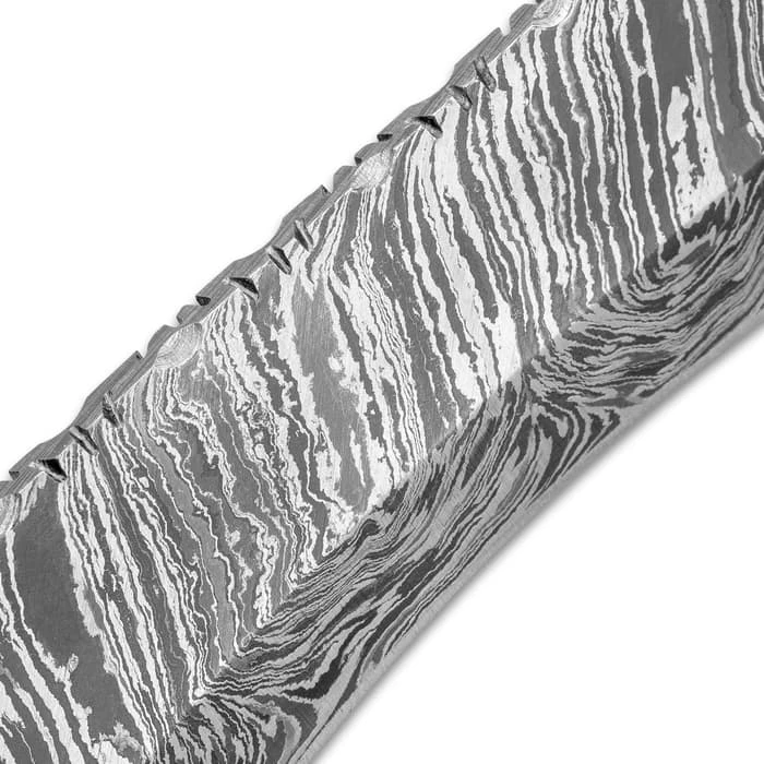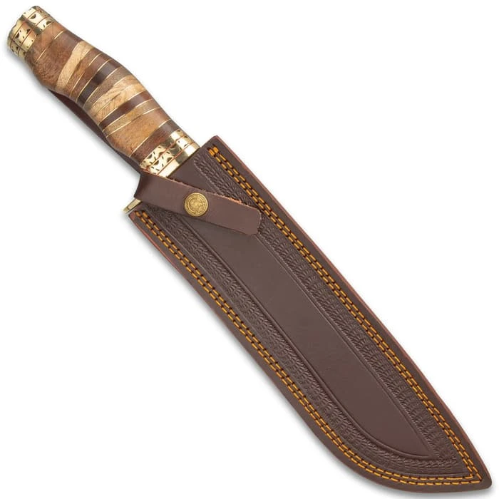 Timber Wolf has no competition when it comes to crafting a knife that is both a striking showpiece and a functional blade that will absolutely get the job done! The Primeval Canyon Machete is a perfect example of the craftsmanship and supreme quality that are the hallmarks of the brand. The fixed blade knife has a keenly sharp, 10” Damascus steel machete blade with a fire pattern and intricate filework along the top of the spine. The handle is crafted of varying shades of walnut wood in bands separated by brass spacers and brass filework accents. The gently curved, comfortable handle has brass elliptical handguard that complements the brass fileworked pommel. The 15 1/4” overall fixed blade knife fits like a glove in its premium, genuine leather belt sheath, which has a snap closure strap. When you’re looking for a workhorse knife you can depend on, Timber Wolf is always your go-to!