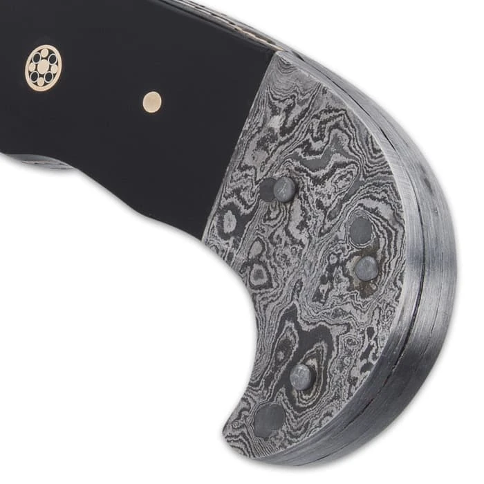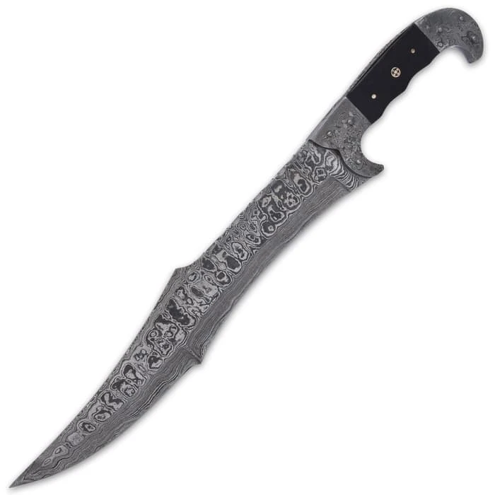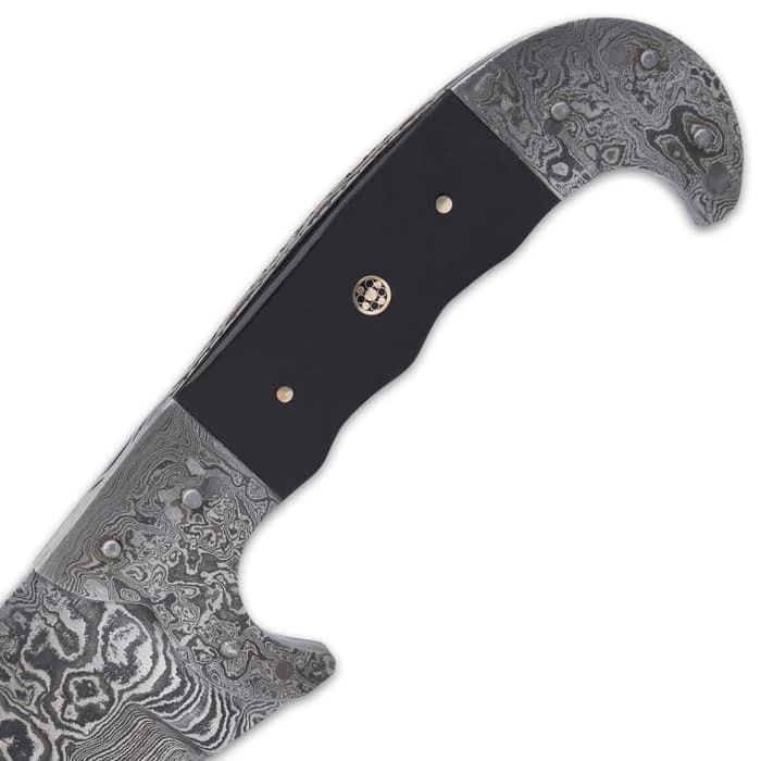 The Timber Wolf Shah Machete is sleek and elegant from sharp point to curved pommel, yet it’s also an exceptionally capable slicing and cutting tool. The full-tang, fileworked 12 1/2” Damascus steel blade has a trailing, modified clip point with a penetrating point. The curved Damascus steel handle has walnut wood handle scales, accented with mosaic rosettes and brass pins. The 17” overall machete slides smoothly into a black, premium leather belt sheath with a neck strap and snap closure.