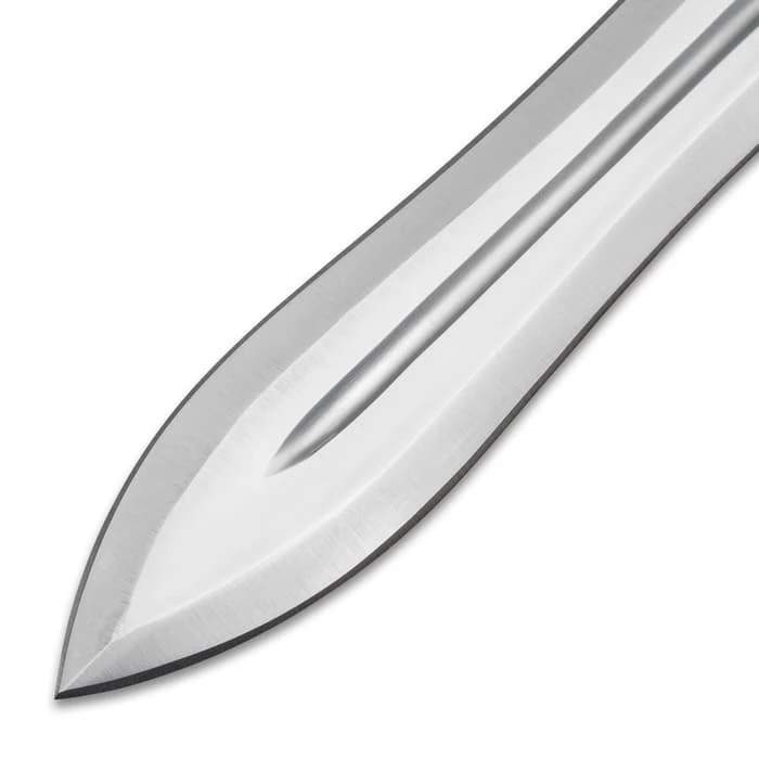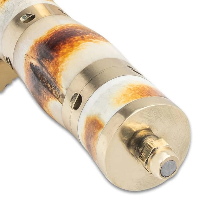 The Timber Wolf Stag Stalker Dagger is as lethal as it is handsome, making it well-suited to be at your side when you’re hunting. The dagger has an 8 1/4” stainless steel, double-edged blade with a fuller running its length and it extends from a fileworked guard. The rounded handle is crafted of genuine stag bone, accented with brass bands, and it’s topped with a brass pommel. The 14” overall dagger can be carried and stored in its premium leather belt sheath, which has double top-stitching.