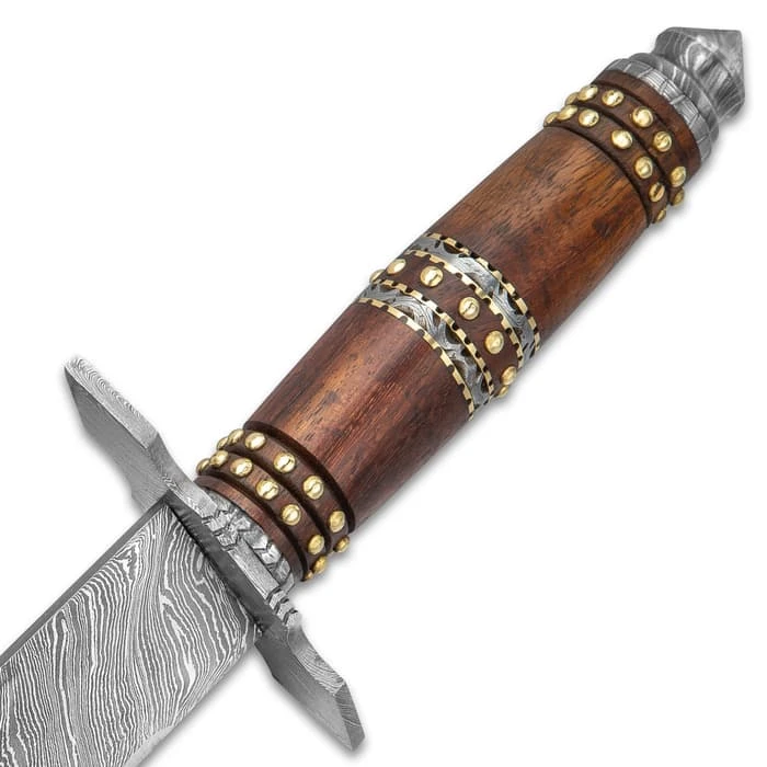Timber Wolf Tower Guard Dagger And Sheath – Damascus Steel Blade, Wooden Handle, Brass Accents, Damascus Guard – Length 16”