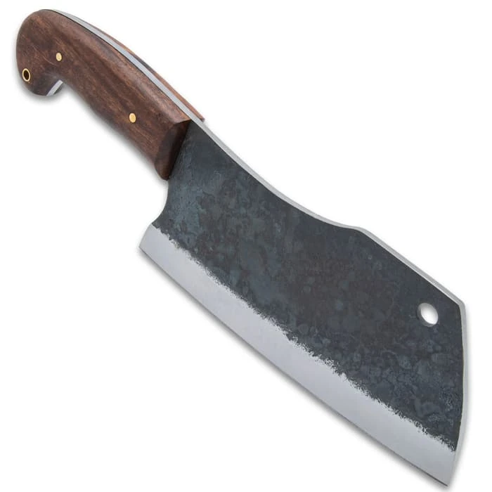 Timber Wolf Trail Cleaver Knife And Sheath – 1095 Carbon Steel Blade, Rough-Forged, Wooden Handle, Brass Pins – Length 12”