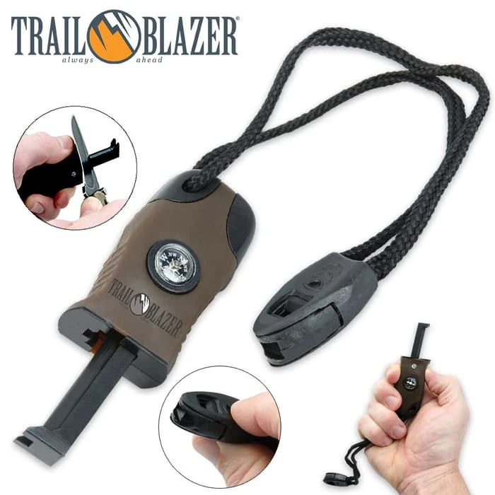 With this Multi-Functional Survival Tool from Trailblazer®, you will always be prepared! The injection molded ABS and TPR construction allows you to keep a firm grip as you push the fire striking rod to create a spark. This survival tool also has a small compass and a lanyard cord with a whistle, so you will have everything you need in one lightweight, compact tool!