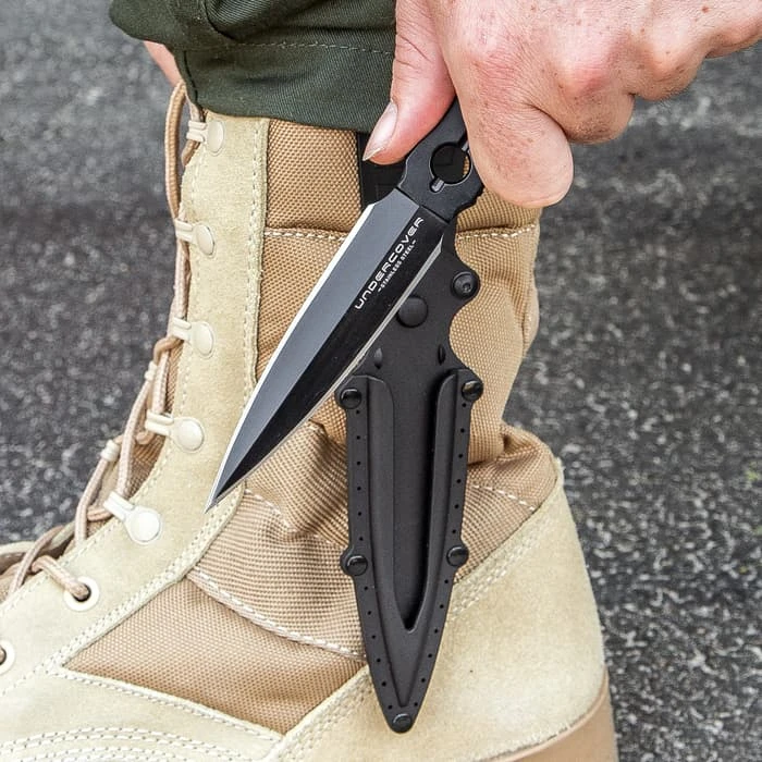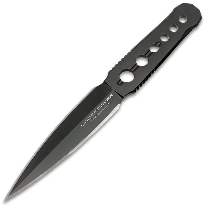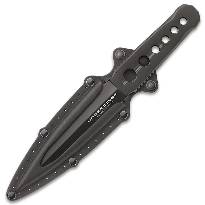 Undercover CIA Stinger Knife And Sheath – One-Piece 3Cr13 Steel Construction, Black Oxide Coating, Thru-Holes – Length 7 1/8”