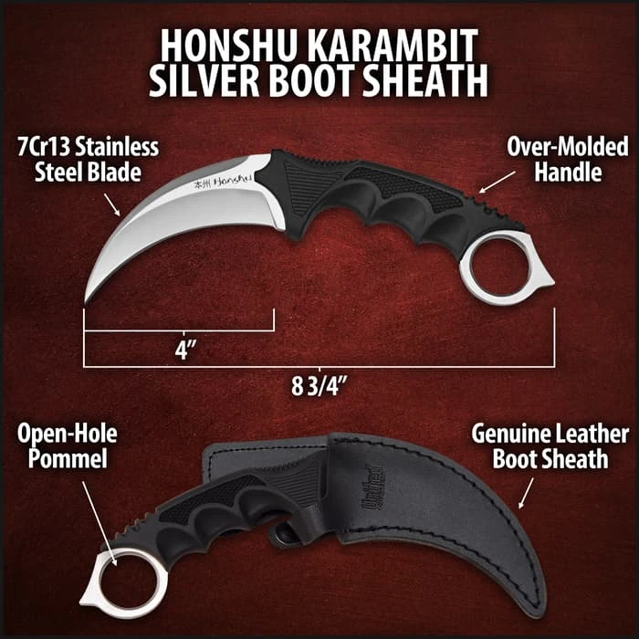 When you need an easily concealed defense weapon, this Honshu Karambit knife is exactly what you are looking for. It features a 4″ 7Cr13 stainless steel blade and an over-molded handle with an open-hole pommel for an easy grip. It includes a genuine leather boot sheath with a clip. It’s 8 3/4″ overall.