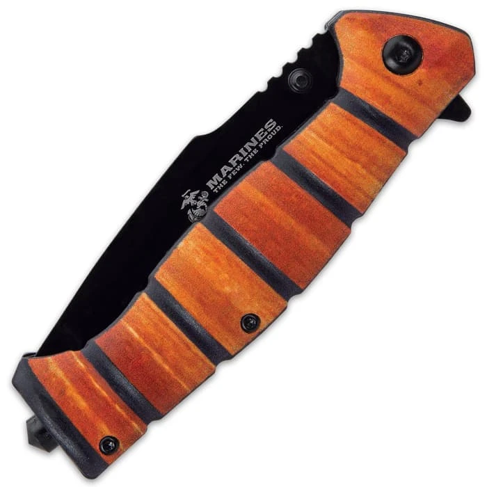 An homage to the iconic fixed blade knife carried by Marines for decades, our USMC Classic Marine Pocket Knife has the familiar stacked leather handle look. It has a 3 1/2” razor-sharp stainless steel blade with a black, non-reflective finish, which can be deployed with thumbstuds, and finger jimping gives you excellent control. The TPU stacked handle is 3-D printed to mimic the iconic stacked leather handle of the traditional Marine fixed blade. The officially licensed knife is 4 1/2”, when closed, and features a pocket clip with a wire-cut “USMC” and a glass breaker.