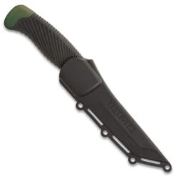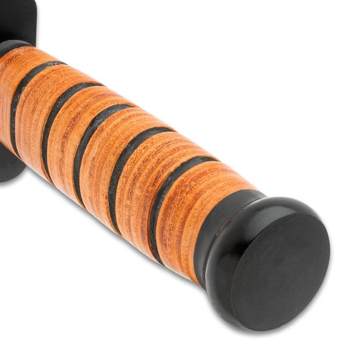 United Cutlery’s classic USMC combat fighter knife features a rock solid 420 stainless steel fixed blade with a heat treated black finish. The 7″ clip point blade is razor sharp and includes a heavy blood groove. The genuine leather handle is stacked just like the classic knives traditionally carried by Marines, complete with a protective hand guard and cast pommel. This top quality fixed blade knife comes to you with a handsome embossed leather sheath.