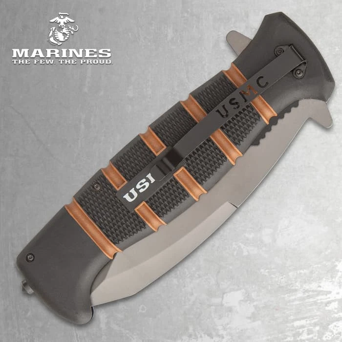 Officially licensed by the United States Marine Corps, the monster-sized USMC Maximum Assisted Opening Pocket Knife is built for hard use and tough missions. It has a 5 3/4” titanium-coated stainless steel blade with a non-reflective finish and the Marine Corps logo etched in white. The double flippers let you access the beefy blade quickly with the assisted opening mechanism and it locks securely open. The heavily textured black handle is crafted of TPR, featuring deep brown grooves, and it has “USMC” in white and a glass breaker. The assisted opening pocket knife is 7”, when closed, and has a sturdy metal pocket clip with “USMC” wire-cut into it.