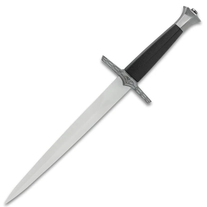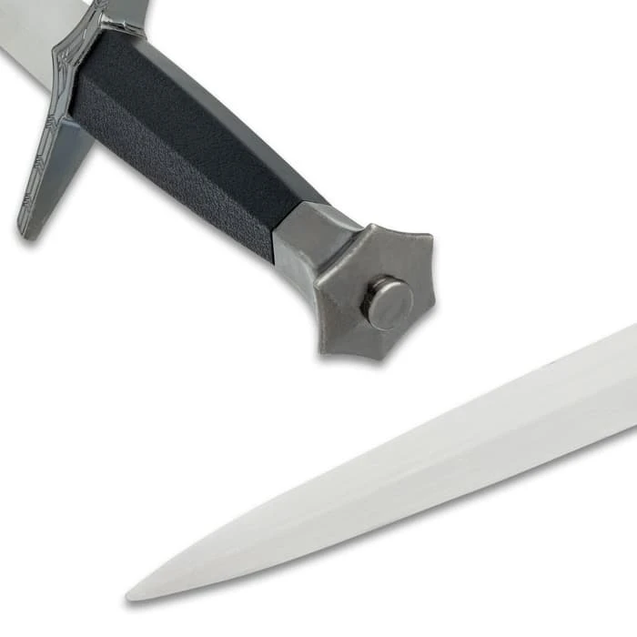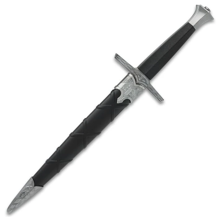 The Witching Black Short Sword makes a great conversation-piece for a coffee table or as an addition to your fantasy collection. The display-edged blade has a mirror-polished finish, and it extends from a decorative crossguard with an antiqued finish. The sword can be wielded by its textured, black handle, which is topped by a crown-styled pommel. The included black scabbard is made of ABS with an embossed metal throat and tip that has an antiqued finish.